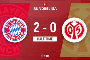 第27分钟,拜仁取得领先,莱默尔传中,萨内打门被阻挡,他随后再次得到皮球右脚低射远角得手,拜仁1-0领先美因茨。↓